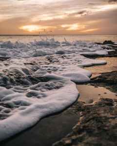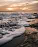 sea waves crashing on shore during sunset